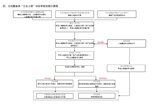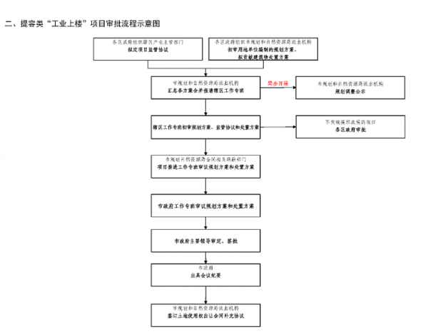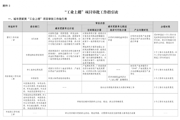 政府统筹、市场运作。市政府高位部署,职能部门政策支持, 各区政府强力推进,共同推动“工业上楼”项目落地。国有企业带头参与,充分调动国有企业、民营企业等各方面的积极性,发挥建设、运营、管理优势,体现责任担当,主动推进项目实施。分级联审、封闭运行。建立“市政府—职能部门—各区政府” 的三级联审制度,同一层级审批事项通过专班会议一次性审议通过,提高审批效率。纳入“工业上楼”的项目封闭运作,各区各部门依法依规、守正创新、提高效率,加快工作任务顺利完成。一园一策、政策支持。严格贯彻落实市政府工作部署,在“保本微利”的前提下,按照“一园一策”“一项目一方案”,用足用好规划、土地、更新、整备、财税、金融等政策手段,强化政策支撑。 按照“1+1+12”的架构成立“工业上楼”推进工作专班,组织架构具体如下:成员单位:市发展改革委、市工业和信息化局、市规划和自然资源局(市城市更新和土地整备局)、市司法局、市国资委、市政府发展研究中心,各区政府,市前海管理局。市政府工作专班主要职责:审议“工业上楼”年度任务、年度项目计划,决策重大事项,套开市政府建设项目用地审批会,审议或审批项目规划方案、土地供应方案等。成员单位:市规划和自然资源局(市城市更新和土地整备局)、市工业和信息化局、市发展改革委、市司法局、市生态环境局、市住房建设局、市交通运输局、市水务局、市国资委、 市政府发展研究中心、各区政府。项目推进工作专班主要职责:各成员单位按各自职能分工对项目方案开展审核工作。工作专班总召集人(或委托副总召集人) 不定期召开专班会议,协调项目存在问题,审议项目规划方案、土地供应方案等。成 员 单 位:各区政府相关职能部门、市相关部门派出机构等,具体由各单位自行确定。辖区工作专班主要职责:按照审批工作指引(附件 1—3),负责项目规划方案、土地供应方案等的拟订和初审工作,以及城市更新单元计划、规划等的报批、公示、公告等工作。本方案仅针对已经市政府批准纳入“工业上楼”目录的项目,根据实施路径分为城市更新类项目、提容或新供应用地类项目、土地整备类项目三种类型。(一)市规划和自然资源局(市城市更新和土地整备局)。负责项目推进工作专班的日常工作,代专班拟定相关文件, 明确项目的审批流程和审批要求,结合自身职能对项目方案开展审核工作。负责年度项目目录制定及项目运行信息化平台建设,结合自身职能对项目产业布局和导入开展审核工作。会同各区政府建设CIM+BIM 项目信息化平台、开展招商引资工作,对项目产业导入、自持厂房比例及租赁价格等事项实施监管,指导签订监管协议。协调推动国有企业参与“工业上楼”项目建设,结合自身职能会同各区政府对项目经济可行性方案开展审核工作,并指导制 定项目投融资方案。制定项目实施后的成本收益核算规则,以内部收益率控制指标为基准,明确相关的收益调配机制。负责将“工业上楼”项目纳入年度固定资产投资计划和市政府重点工程予以推进和管理,结合自身职能对项目开展审核工作。负责定期对项目运行情况进行跟踪研究,结合国内外“工业上楼”的先进做法,对“工业上楼”政策提出优化建议。负责辖区内“工业上楼”年度计划及项目的申报工作,负责项目规划方案、土地供应方案等的拟订和初审,以及城市更新单 元计划、规划等的报批、公示、公告等工作,统筹推进项目的具 体实施、产业招商、运营管理及后续监管等工作。针对各类型项目的规划方案、土地供应方案等事项建立“三 审一签”的审批机制。一审由各辖区工作专班按批次开展项目初审;二审由各区政府报送项目推进工作专班会议审议;三审由项目推进工作专班统筹汇总后报市政府工作专班会议审议;一签由市政府工作专班提请市政府主要领导审定、签批。审批具体流程及要求详见本方案附件 1—3。位于前海深港现代服务业合作区范围内的项目参照上述程序,由市前海管理局完成规划方案、土地供应方案(含产业监管协议)拟定、初审(一审)及审核(二审)工作后,报请市政府工作专班会议审议。本方案自印发之日起施行,有效期 5 年,期间可结合项目运行情况适时开展修订工作,相关部门及时总结经验制定新政策并对现行政策进行清理。为加快推进“工业上楼”项目审批工作,优化工作流程,提升工作效能,特制定本工作指引。按照市政府工作部署,根据实施路径分为城市更新类、提容或新供应用地类、土地整备类三种类型,具体流程及要求如下:各区政府及其城市更新机构可同步推动城市更新单元计划和规划的制定、审查、征求意见、公示、报批、公告等工作,进一步提高行政审批效率。 城市更新单元计划申报主体依据《深圳经济特区城市更新条 例》、省“三旧”改造标图建库政策等相关要求制定城市更新单 元计划并按规定开展计划申报工作。 辖区工作专班负责单元计划的初审工作,确保更新意愿符合《深圳经济特区城市更新条例》相关要求、拆除范围符合省“三旧”改造标图建库相关要求,并对城市更新单元计划在合法用地比例、更新方向、建筑物年限、土地移交率、上层次规划、相关 规划控制区域占用及调整等方面与现行政策不一致的情况予以 说明,涉及占用工