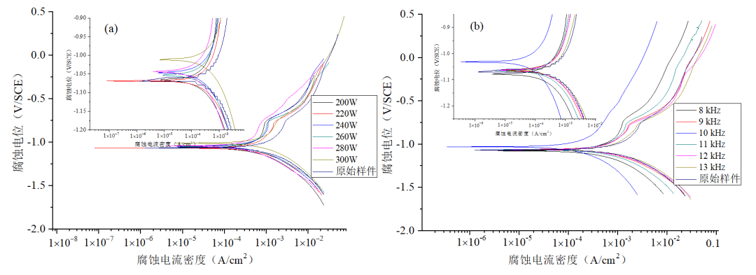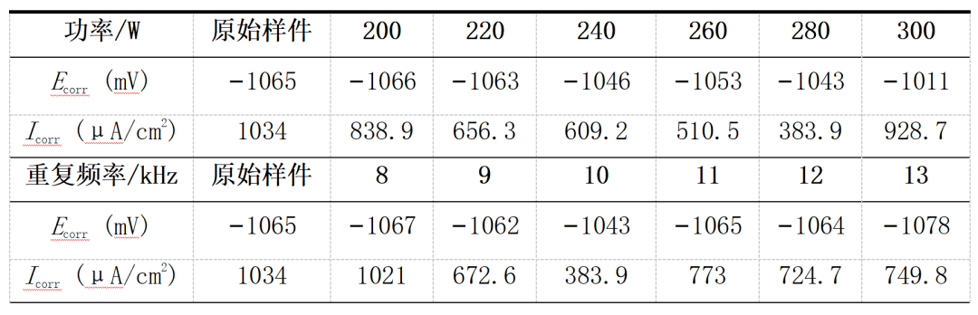 由图15(a)以及表3可以看出,随着欧陆娱乐功率的增加,极化曲线均呈现正向移动趋势,自腐蚀电位逐步增大,即清洗后样件表面的腐蚀动力小幅增强。腐蚀电流密度先减小后增加,表示样件表面的抗腐蚀性能先增加后减小。欧陆娱乐功率增加,腐蚀电流密度最低为383.9,抗腐蚀性能最佳,此时极化曲线中钝化区的钝化平台较宽,样件的钝化状态较稳定。抗腐蚀性逐渐增加的主要原因为欧陆娱乐使样件表面疏松锈蚀氧化物去除的同时,对基体会产生不同程度的热影响,细化晶格,提高表面完整性,从而抗腐蚀性能得到改善。当功率最大时,由微观形貌可知,热累积量过高,表面出现烧蚀坑,熔融物增加,基体发生损伤,抗腐蚀性下降。