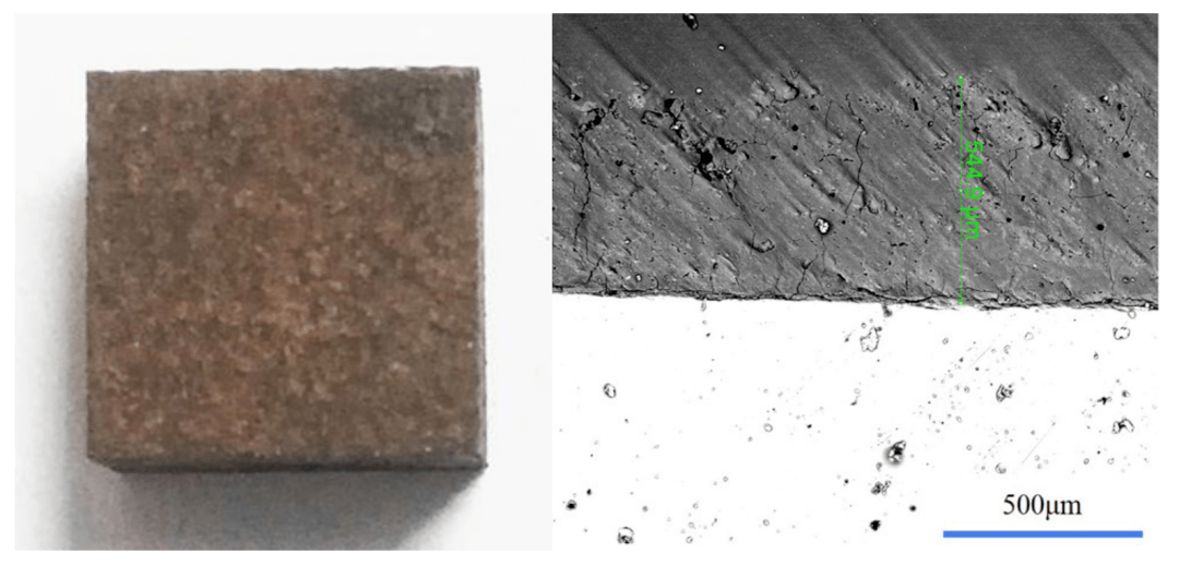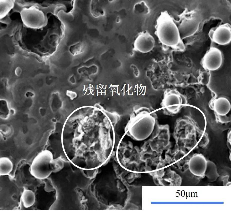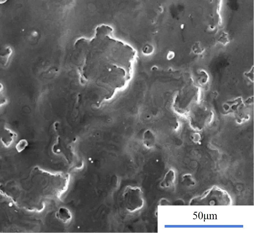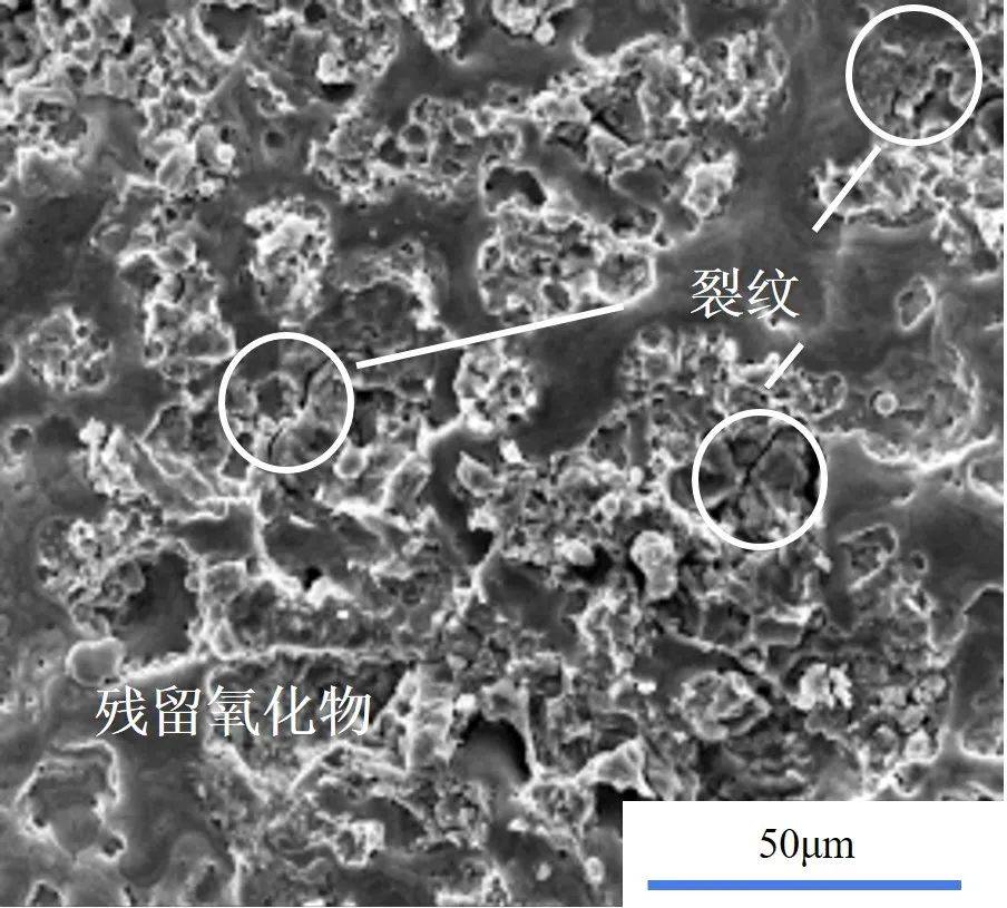 当清洗过程中氧化层厚度较薄时,表面会出现较多裂纹,如图3所示。这是由于更多的欧陆娱乐能量透过氧化层作用于基体表面,基体的线性膨胀系数远大于氧化层,温度变化引起其发生较大的热膨胀,从而使基体和氧化层的界面处存在热应力,导致氧化层产生较多的裂纹。