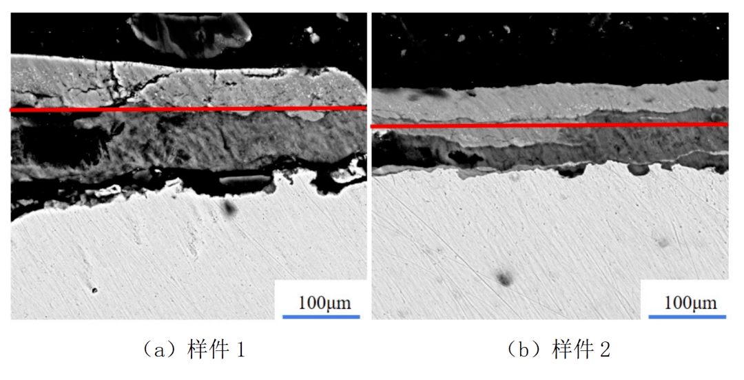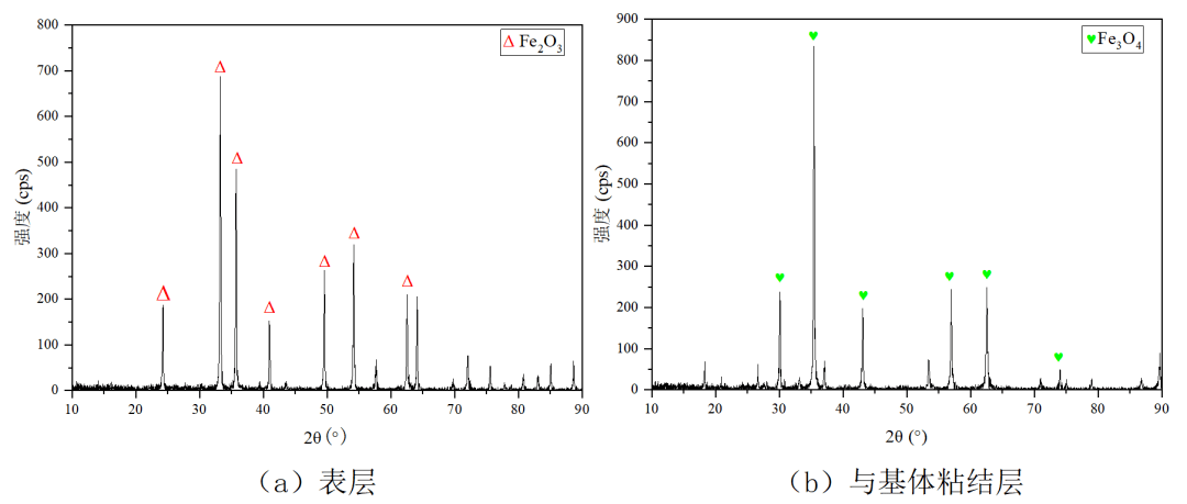 对于测试样件的剖面方向,如图6示。基体表层的不同污物成分间存在明显的界限,即存在两层不同成分的氧化层。进一步采用X射线衍射仪(XRD)对各层的化合物成分进行测定,存在外锈层和内锈层,即外锈层为稀疏的Fe2O3,内锈层为Fe3O4与FeO(少量)的混合物,工作状态的差异会导致氧化层的致密程度等性质有所差异。
