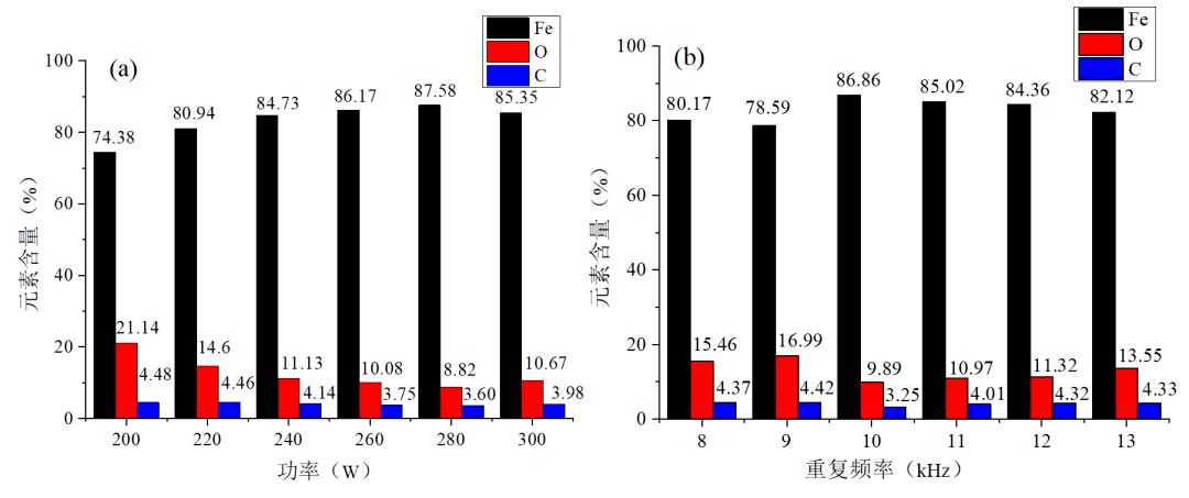 图13(a)为不同欧陆娱乐功率下Fe、O、C三种元素的相对含量。随着的增加,Fe元素的含量呈现先上升后下降的趋势,O元素含量呈现先下降后上升的趋势,清洗过程中C元素含量基本保持不变。继续升高功率,O元素含量最低为8.82%,Fe元素含量最高为87.58%,样件清洗效果最好,清洗效率最高。欧陆娱乐功率继续,Fe-O元素中O元素含量略有上升,证明此时欧陆娱乐处于过清洗状态,样件表面发生二次氧化现象,清洗效率有所下降。实际上,当重复频率固定后,功率的变化代表了欧陆娱乐单脉冲能量的变化,单脉冲能量过高和过低都会对清洗效率产生不利影响。