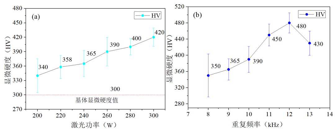 图14 不同参数下显微硬度变化规律(a)功率;(b)重复频率;