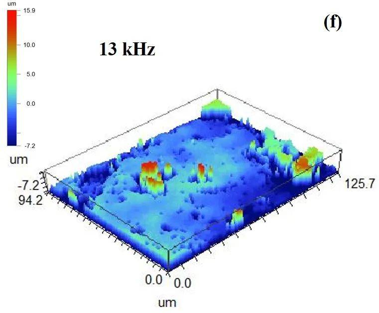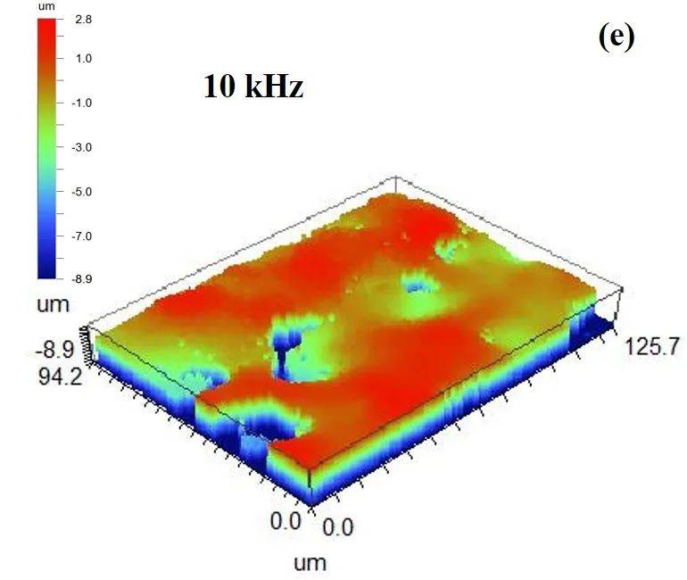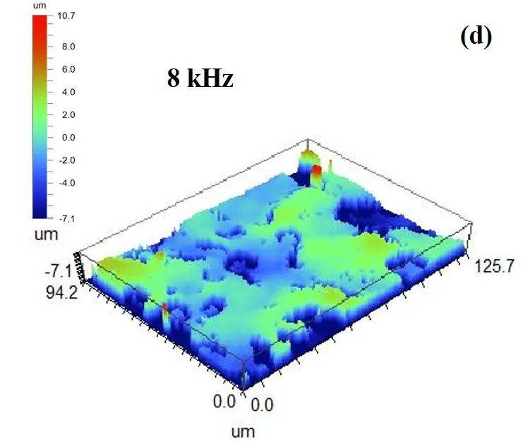 单因素实验探究了不同欧陆娱乐功率、重复频率(脉冲宽度)下,欧陆娱乐清洗前后样件表面粗糙度的变化规律,如图9所示。同时,图10为典型参数下白光干涉仪测试样件的3D形貌。