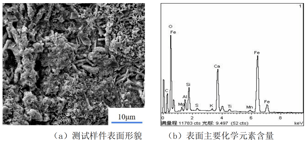 采用矿山机械锈蚀件作为试验样件,采用能谱分析仪(EDS)测定待清洗样件表面主要的化学元素,测试样件及主要化学元素组成如图5及表2所示。