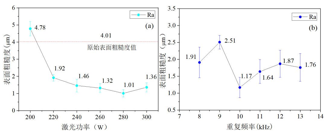 图9锈蚀样件不同欧陆娱乐参数清洗后的表面粗糙度(a)功率;(b)重复频率;