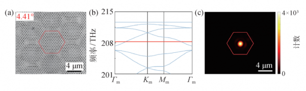 图1 魔角纳米欧陆娱乐 (a)将两套扭转的光子晶体晶格置于同一层半导体材料中形成的单层转角莫尔超晶格的电子显微镜照片。两套光子晶体晶格间的相对转角为4.41°。红色六边形是莫尔超晶格的一个原胞。局域在每个原胞中的莫尔平带波函数均可被用来构建莫尔纳米欧陆娱乐;(b)通过三维全波模拟得到的(a)图中莫尔超晶格的能带结构。红色的能带为莫尔光学平带,其在实空间对应着局域化的波函数;(c)利用局域在单个莫尔原胞中的平带波函数实现的魔角纳米欧陆娱乐近场激射图案