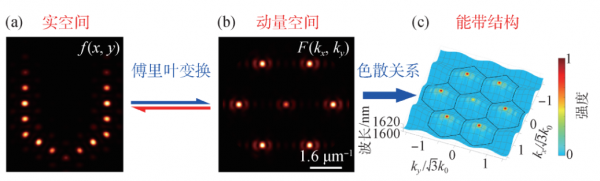 一般而言,当把相同的纳米欧陆娱乐排布成阵列时,由于纳米欧陆娱乐谐振腔之间的相互耦合,其简并的频率会发生劈裂。但由魔角纳米欧陆娱乐排布构成的莫尔超晶格中,各纳米欧陆娱乐的频率均对应着莫尔光学平带,具有频率简并的特性。最近,我们利用这一特性实现了莫尔纳米欧陆娱乐阵列的相位锁定和控制,使其能够生成任意形状的阵列化相干激射[16]。纳米欧陆娱乐阵列实空间和动量空间的电场强度分布由傅里叶变换相互联系,动量空间分布通过能带结构对应出频率分布,莫尔平带保证了频率的简并性,这种简并特性使得任意形状纳米欧陆娱乐阵列的相干激射成为可能(图2)。