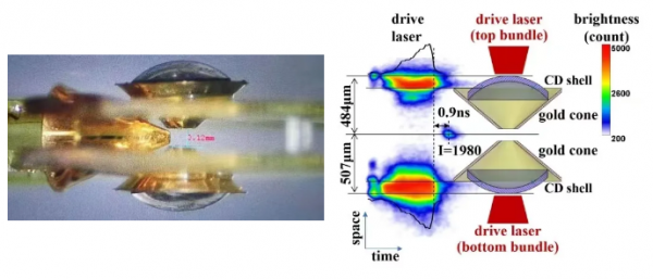 图1 DCI实验用靶和X射线条纹相机测得的时空分辨的对撞过程