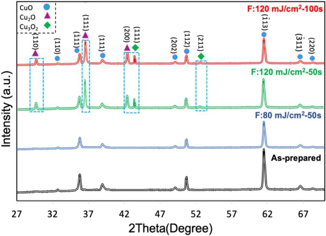 图 3.制备前与飞秒辐照后氧化铜纳米线的XPS分析。