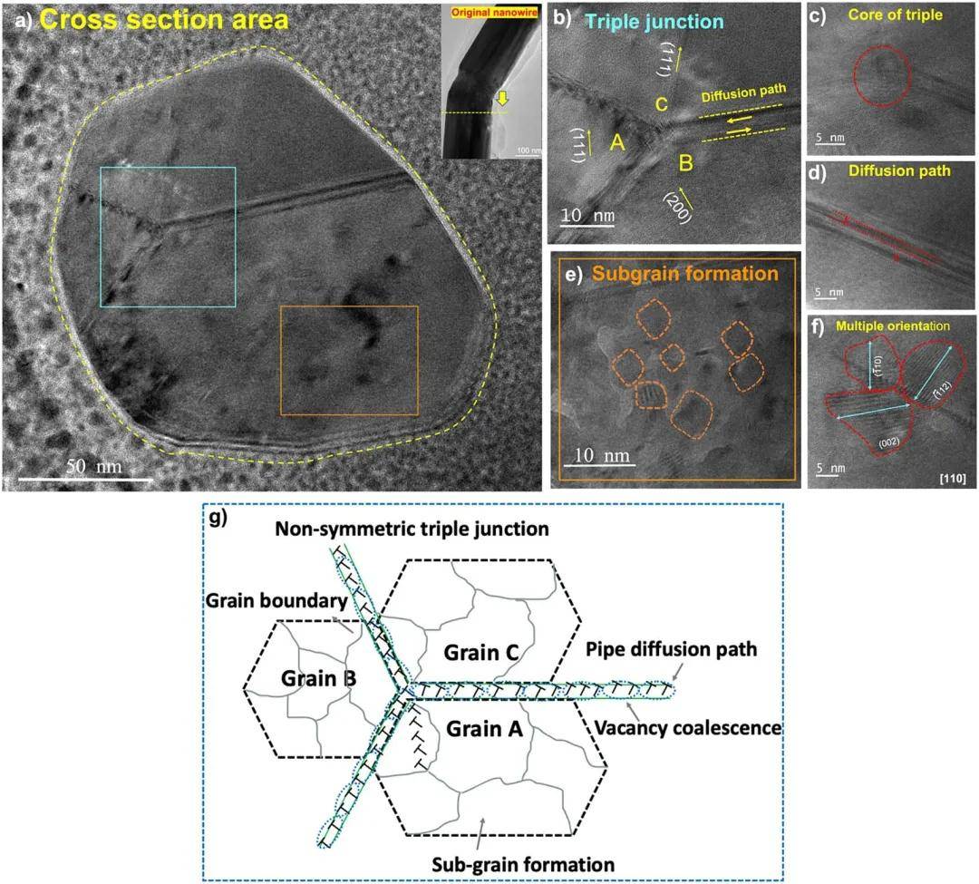 图 6.在120 mJ/cm2的通量下欧陆娱乐照射50秒后弯曲纳米线的TEM表征。