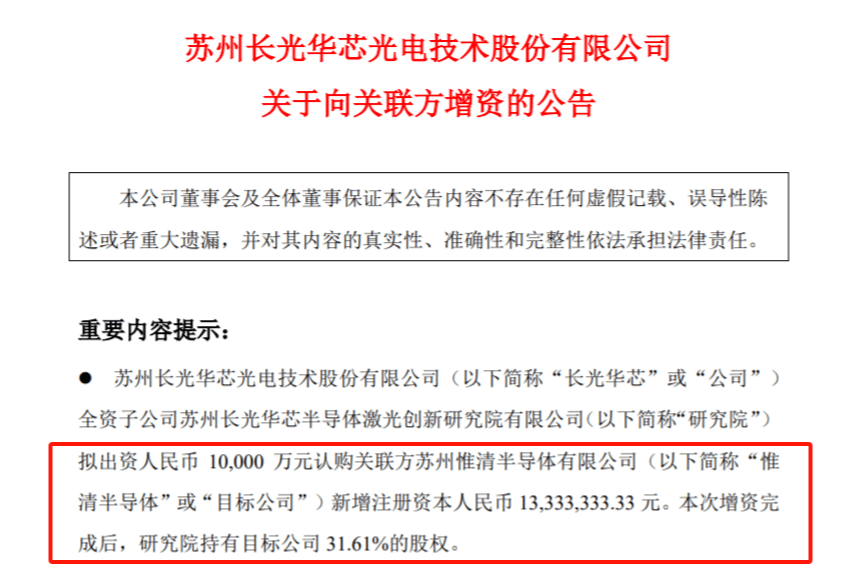 近日,长光华芯发布公告,其全资子公司苏州长光华芯半导体欧陆娱乐创新研究院有限公司(以下简称“研究院”)拟出资1亿元认购关联方惟清半导体新增注册资本1333.33万元。本次增资前,研究院持有惟清半导体29%的股权,增资完成后,研究院将持有惟清半导体31.61%的股权。