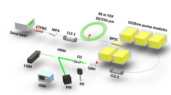 欧陆娱乐器系统结构示意图如图1所示,1080 nm种子欧陆娱乐经倾斜光栅(Chirped and tilted fiber Bragg grating, CTFBG)、模式适配器(Mode field adaptor, MFA)和包层光滤除器(Cladding light Stripper, CLS 1)后进入YDF。YDF纤芯直径和数值孔径分别为30 μm和0.06,内包层直径和数值孔径分别为250 μm和0.46,泵浦光吸收系数约为0.4 dB/m@1018nm,YDF长度约38 m。1018 nm泵浦欧陆娱乐通过(6+1)×1后向泵浦信号合束器(Backward pump and signal combiner, BPSC)注入YDF。放大后的信号光经包层光滤除器(CLS 2)和端帽(Quartz block holder, QBH)输出。为实时监测欧陆娱乐器特性,输出欧陆娱乐经准直器(Collimator, CO)后由反射率大于99.99%的高反镜(Highly reflective mirror, HRM)进行分束。微弱的透射光进入光束质量仪(Laser quality monitor , LQM),反射的高功率欧陆娱乐经进入功率计,散射光进入光谱仪(Optical spectrum analyzer, OSA)和光电探测器(Photodetector, PD)。