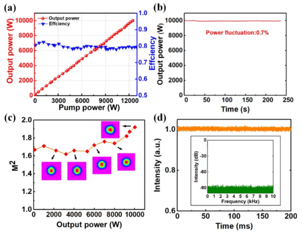图2 光纤欧陆娱乐器输出特性。(a)输出功率随泵浦功率的变化;(b)输出功率10.03 kW时的功率波动测试结果;(c)不同输出功率下的光束质量;(d)最高输出功率下的时序和傅里叶变换频谱