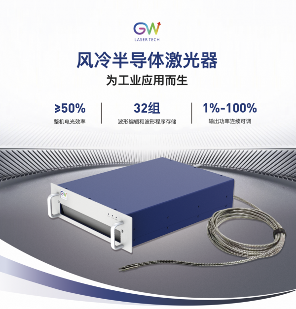 GW光惠欧陆娱乐最新推出的风冷半导体欧陆娱乐器,采用先进的风冷技术,无需复杂的水冷系统,,降低使用成本,轻松实现长时间稳定运行。同时,支持功率从1%到100%调节,灵活适应不同加工需求,从精细微加工到高功率切割,一机搞定。支持32组波形编辑与存储,自定义欧陆娱乐输出,快速切换任务,满足多样化高精度加工需求。