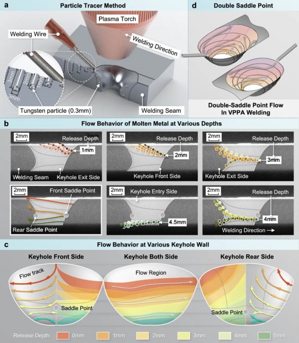 由于原位X射线成像成本高且应用受限,研究团队采用粒子追踪技术分析熔池金属流动行为,提出双鞍点流动模型,发现离子气流量和电流等对鞍点位置和流动通道面积有显著影响。将准静态焊接特征作为物理约束条件,构建数据驱动的物理鞍点模型,实现用低成本数据预测关键特征。