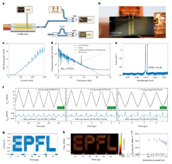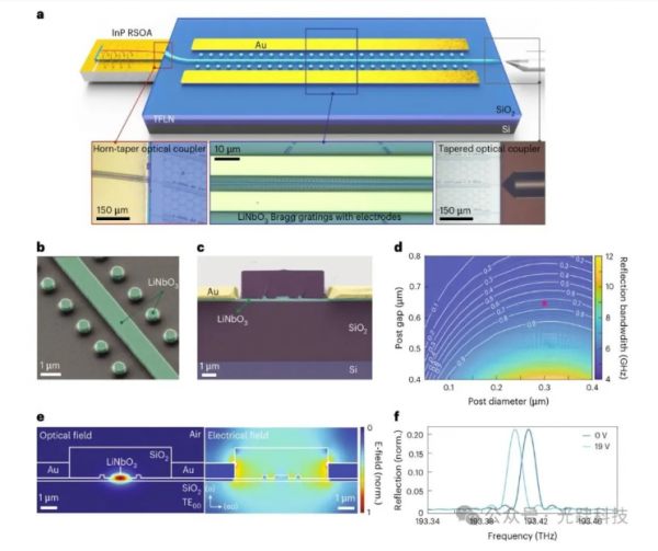 a, 混合集成 E-DBR 欧陆娱乐器的示意图。TFLN:薄膜铌酸锂。插图为:InP RSOA 与 PIC 之间的对接耦合界面的详细显微照片(左);布拉格光栅和调谐电极(中);用于输出耦合的双层锥形结构和透镜光纤(右)。