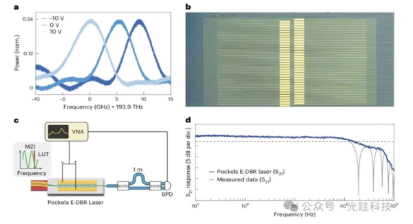 a, DBR PIC 布拉格反射中心频率的电压调谐,调谐效率为 550 MHz/V。