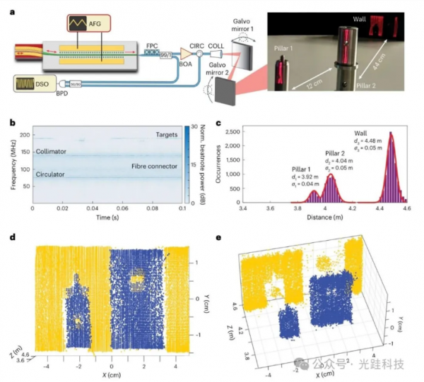 a, 基于FMCW欧陆娱乐雷达的相干光学测距实验装置示意图,并附有目标场景的照片:两个Thorlabs立柱基座(直径分别为1毫米和2.5毫米)以及后面的一堵平墙。DSO:数字采样示波器;FPC:光纤偏振控制器;BOA:后置光放大器;CIRC:环形器;COLL:准直器。