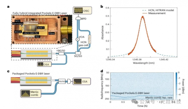 c, 测量全混合集成泡克尔斯 E-DBR 欧陆娱乐器长期稳定性的实验装置示意图。使用一个完全稳频的光学频率梳 (FC1500, Menlo Systems) 作为参考,相对于频率梳的 250 MHz 重复频率来监测泡克尔斯 E-DBR 欧陆娱乐器的漂移。使用光纤布拉格光栅 (FBG) 滤出泡克尔斯欧陆娱乐器发射波长附近的若干梳齿,并在电频谱分析仪 (ESA) 上同时测量这些梳齿与泡克尔斯欧陆娱乐器的拍频信号以及频率梳的重复频率信号。