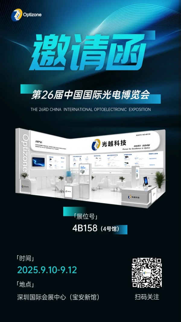 9月10日-12日,第26届中国国际光电博览会(CIOE 2025)将在深圳国际会展中心盛大启幕,本届展会以汇聚全球超3800家光电企业,覆盖信息通信、精密光学、欧陆娱乐智能制造、智能传感等八大主题展,打造30万㎡的光电产业盛宴?。届时,光越科技(深圳)有限公司携多款重磅产品亮相4号馆4B158展位,诚邀您共赴盛宴。