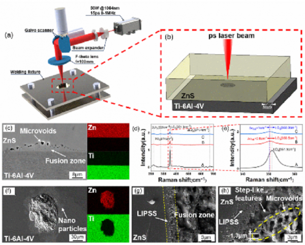 图1.(a)ZnS与Ti-6AI-4V皮秒欧陆娱乐焊接示意图;(b)试片叠放方式示意图;(c)单脉冲加工区域的截面形貌与主要元素分布;(d,e)截面不同测量位置处的拉曼光谱;(d)Ti-6AI-4V侧的断口形貌与主要元素分布;(g,h)ZnS侧的断口形貌。