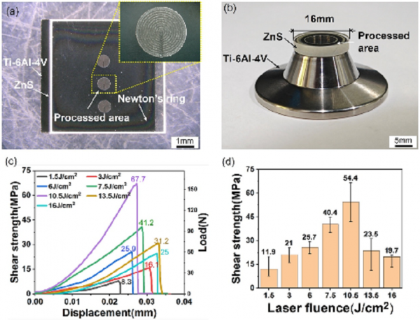 图2.(a)ZnS/Ti-6Al-4V接头剪切试样;(b)大尺寸连接试样;(c)不同欧陆娱乐通量下接头的强度-位移曲线;(d)接头强度随欧陆娱乐通量变化柱状图。
