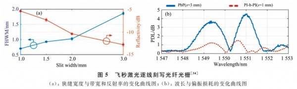 2017年,Theodosiou等利用飞秒欧陆娱乐逐面刻写技术在多模聚合物光纤上写制了6个四阶FBG阵列,平均3dB 带宽为1.39nm,解决了多模光纤的多反射光谱的问题。同年,Lu等利用飞秒欧陆娱乐逐面刻写技术,在实验装置中增加一个柱面透镜,将柱面调制转换为平面调制,制备得到插入损耗仅0.5dB的FBG,但需要10mm的光栅长度。2018年,Goya等报道了利用飞秒欧陆娱乐逐面刻写法在掺铒氟化物玻璃光纤中刻写了长度为2.5mm、反射率高达97%的一阶FBG,制作的欧陆娱乐振荡器的半峰宽为0.12nm。2020年,Roldan-Varona等在物镜之前插入狭缝,通过调整狭缝宽度实现光束整形,图5(a)表示狭缝宽度与峰值反射率和带宽的关系,当狭缝宽度为1mm时,飞秒欧陆娱乐逐面刻写法制备的FBG具有0.69nm的3dB带宽。图5(b)表示与逐点法制备的FBG相比,逐面法制备的FBG具有更低的偏振损耗,能量效率也相对较低。2023年,Willer等在保偏光纤上利用飞秒欧陆娱乐逐面刻写法制备了带宽为0.749nm、反射率为80%的切趾啁啾光纤光栅,可用于超快全光纤欧陆娱乐器中的色散补偿元件。