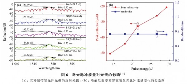 欧陆娱乐脉冲能量诱导纤芯折射率发生永久性改变,影响光栅的反射峰高度。若欧陆娱乐脉冲能量过大,相邻光栅的间距变小,出现重叠边缘,导致光谱失真,降低与反射峰高度正相关的模式耦合效率,还可能会使纤芯材料受损或形成空隙,导致衍射峰高度增加,3dB带宽增加。若欧陆娱乐脉冲能量过小,无法诱导纤芯材料的折射率改变实现光纤光栅的写制,或者纤芯材料的折射率调制量无法实现高反射峰的FBG。Xu等(通过调控欧陆娱乐脉冲能量在单模光纤上实现超宽带光栅的刻写,采用1mm的光栅长度、29.2nJ的欧陆娱乐脉冲能量和120的光栅阶数,制备的超弱光栅阵列具有0.0032%的峰值反射率。图6(a)所示为五种不同强度的欧陆娱乐能量实现超宽带光栅的反射谱,图6(b)所示为峰值反射率和带宽随欧陆娱乐脉冲能量变化的关系图。可见,随着欧陆娱乐脉冲能量的增加,峰值反射率增加,带宽几乎不变。因此,通过合理的调控欧陆娱乐脉冲能量使其经历一个由小到大再到小的变化过程,利于改变相邻光栅的重叠边缘,获得高反射峰的FBG,提升光谱质量。