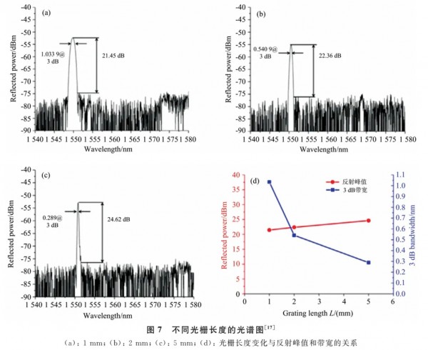 根据均匀光栅的最大反射率公式R=tanh?(κL)(其中κ为耦合系数,L为光栅长度)可知,光栅的峰值反射率与光栅长度密切相关,通过适当增加光栅的物理长度L,可以使光谱的3dB带宽变窄,提高光栅的反射率。Zhang利用飞秒欧陆娱乐逐点刻写法在单模光纤上分别刻写光栅长度为1、2和5mm的FBG,反射光谱如图7(a)—(c)所示,反射高度和3dB带宽的关系如图7(d)所示,反射峰高度随着光栅长度的增加而增加,光谱3dB带宽随着光栅长度的增加而变窄。当光栅长度为5mm时,反射峰值为24.62dB、3dB带宽为0.289nm。虽然光栅长度的增加可以获得高反射峰值,但增加了写制难度,对调焦程序也提出了更高的要求,因此,选择合适的光栅长度,对实现高质量光栅是十分重要的。