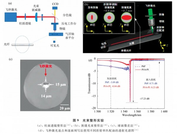 飞秒欧陆娱乐脉冲的非线性吸收和雪崩电离,使纤芯中聚焦的边缘形态是椭圆形微空隙,导致飞秒欧陆娱乐直写的光纤光栅表现出高双折射。由于光纤纤芯的不对称性使光纤光栅的耦合强度系数与散射损耗系数κ/α的比值降低,影响光纤光栅的反射率。改变飞秒欧陆娱乐脉冲聚焦的几何形状,降低双折射的技术方法大致分为四种:(1)柱面透镜整形法如图 9(a)所示,Lu等通过在一个平凹透镜和一个平凸透镜组成的光束缩小镜后面放置一个柱面透镜,以缩小光束直径匹配显微物镜的孔径,FBG的插入损耗为0.5dB,但光路调整相对复杂。(2)狭缝光束整形法如图9(b)所示,Xu等通过在物镜之前插入一个可调谐狭缝,改变狭缝宽度实现欧陆娱乐束的调整,随着边缘尺寸的增加,折射率调制面积将扩大,模重叠因子增大,实现了反射率高达99.12%、插入损耗仅为0.3dB的FBG。(3)球面像差法如图9(c)所示,Wu等利用盖玻片引入球面像差的方式,扩展折射率调制区,实现 95.83%的高反射率FBG。(4)折射率匹配油法,Li等使用不同折射率的匹配油均匀的涂覆在光纤上,再利用飞秒欧陆娱乐逐面刻写法制备光栅,当折射率匹配油为1.7时,FBG的反射率达到98.1%、插入损耗仅为0.23dB,光谱图如图9(d)所示,当反射率相同时,比飞秒欧陆娱乐逐点刻写法实现的FBG具有更低的插入损耗。