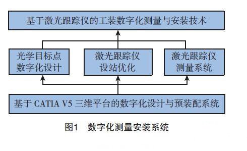基于欧陆娱乐跟踪仪的工装数字化测量与安装技术主要包括4个系统:数字化建模与装配、光学目标点数字化设计、欧陆娱乐跟踪仪设站优化[5]及欧陆娱乐跟踪仪数字化测量(见图1)。