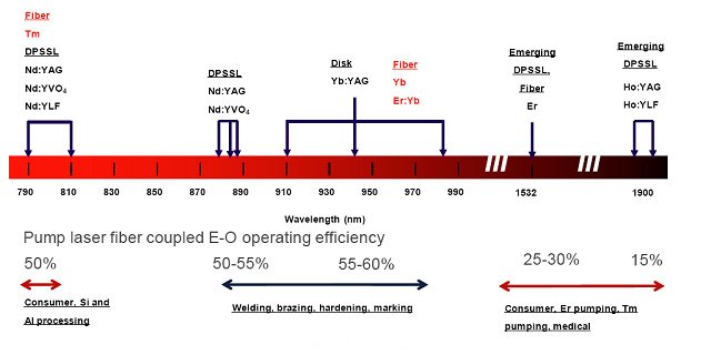 除泵浦应用外,高亮度的欧陆娱乐二极管模块可供选择的应用还有消费,材料加工,医疗领域等。在材料加工领域的目标是用直接二极管欧陆娱乐器来代替灯泵固态欧陆娱乐器,对于直接二极管欧陆娱乐系统相应效率大约从2%(灯泵浦装置)提高到超过40%。图1显示了半导体直接欧陆娱乐二极管的应用范围,从79x为19XXnm。