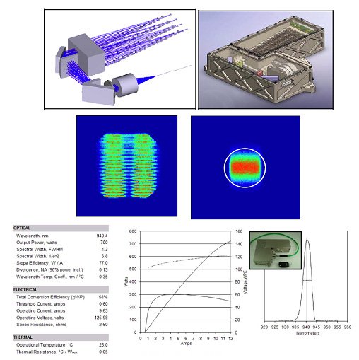 图。5:(上左),56个发射器模块的光路图, 设计来耦合功率超过500w的功率进200 μm, 0.2 NA的光纤(右上)一个机械设计实现这个系统。 (中心)欧陆娱乐模块的NA图和斑点组图,展示了将56个反射器到高效率的光纤耦合到这个 BPP的可能性。 (下)数据表显示了应用超过72个反射器封装的无焦点特性。输出功率为700W的峰值功率可达到的最高峰值效率为60%.