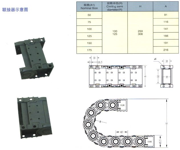 承重型工程塑料拖链系列 TZ35系列 型号 内腔(高X宽) 外腔(高X宽) 弯曲半径(R) 节距 不支撑长度(M) 型式 35.50 35x50 66x91 100.125 65 8 上下盖均可开,滚轮桥...