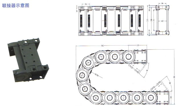 型号 内腔(高X宽) 外腔(高X宽) 弯曲半径(R) 节距 不支撑长度(M) 型式 62.150 62x150 100x213 150 100 30 上下盖均可开,滚轮桥式,滚轮全封闭
