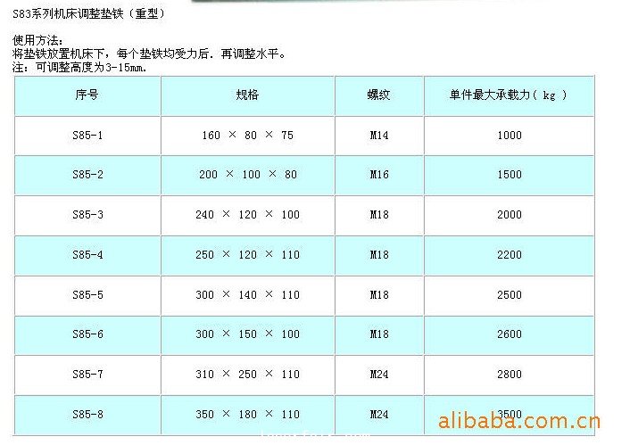 将调整垫铁分别放在机床各受力点下,每个垫铁均受力后,然后调整垫铁。可调整高度为3mm--15mm 铸铁调整垫铁调整方便,迁移灵活,不用打洞埋设地脚螺丝,不破坏地面,是机床设备安装工艺的一大改革。能改善同床动态特性,提高机床加工精度,具有防震、降低噪音之功能。省工、省时、省材料、综合经济济益高。为设计部门解决了因设备选型困难,造成地面基础无法确定的矛盾。通用性广,适用安装各类机床与设备。