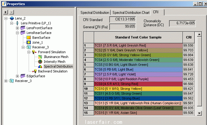 在选择上面的选项后,光学系统的频谱分布和CRI就会在模拟中添加。可以选择和查看CRI数据。