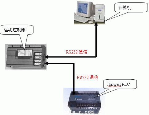 利用Haiwell PLC的易用的通信功能:标准配置2个通信口,1个RS232通信口,1个RS485通信口。用Haiwell PLC的 RS232口与运动控制器的RS232口通信,Haiwell PLC作为通信主站,运动控制器作为通信从站,便捷经济的实现运动控制器的IO扩展。