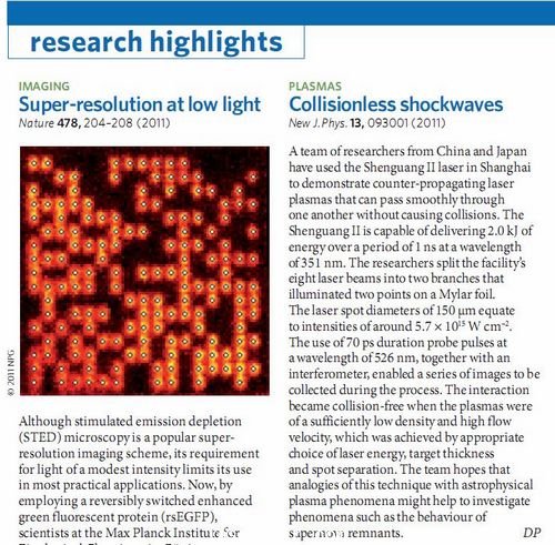 近日获悉,由中、日、韩三方八个研究单位组成的联合实验小组在神光Ⅱ装置上进行的无碰撞冲击波实验物理成果在New Journal of Physics(X Liu et al 2011 New J. Phys. 13 093001)上发表后,被Nature Photonics(David Pile. 2011 Nature Photonics 5, 644,该刊影响因子为26.508)在Research Highlights中重点推介。该报道以Collisionless shockwaves为标题,称研究小组使用上海神光Ⅱ欧陆娱乐装置演示相向传播但可以无碰撞自由相互穿行的实验。