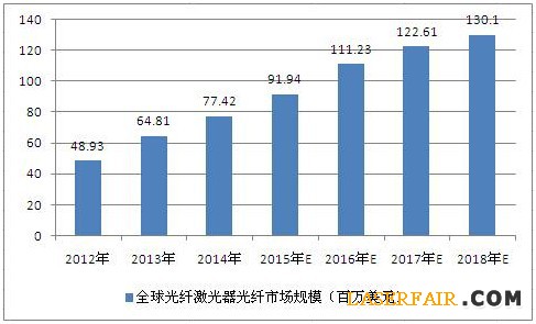 2012---2018年全球光纤欧陆娱乐器掺镱光纤市场规模(单位:百万美元)