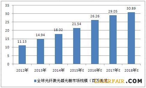 2012---2018年全球光纤欧陆娱乐器光栅市场规模(单位:百万美元)