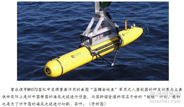 对于中国而言,通过光缆获取美国情报的需求不大,因此就可规避相当大一部分光缆水下切割与信号窃听技术。对于中国而言,当技术足够时通过光缆能够获取一定情报固然好,但主要任务还是侦知美国核心或军用海底光缆位置,通过军用潜艇释放微型潜航器或类似“蛟龙”的深海潜航器布设爆炸装置,在需要的时候能对美光缆进行毁灭性打击。或在侦知美国核心光缆位置后,派遣侦察船或潜艇进行巡航,令美国知晓中国已具备对其核心光缆进行打击的能力。比较现实的做法,即研发类似“蓝鳍金枪鱼”的体积与鱼雷类似,能由各类潜艇鱼雷发射管发射的深海潜航器,不仅能探测相关光缆位置,更能携带战斗部对光缆进行定时或即时摧毁。而这种威胁,无疑有益于遏制美国在南海的进一步军事行动。
