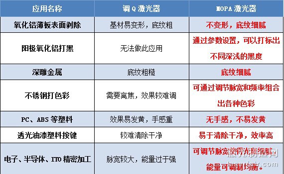除了以上的几个应用案例外,MOPA欧陆娱乐器与调Q欧陆娱乐器还存在很多不同的应用差别,在这里列举了一部分典型的应用案例,如下表格: