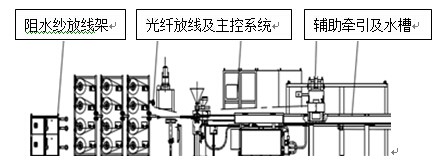 由于松套管冷却速度快,结晶不完整,在冷却以后会有回缩现象,这在没有油膏填充时情况更为明显,因此造成套管中光纤余长控制的困难,尤其在采用后收缩较大的材料生产套管时这一问题更为突出。为此,我们在主牵引和机头之间设置了辅助牵引,这个牵引的速度比主牵引要稍微快一点,使得套管在热状态下进行压缩,材料结晶更充分,松套管非常稳定,在冷却以后不会收缩,很好地控制了套管中光纤的余长。同时采用气体填充,可以很好控制松套管的直径。下面是生产线组成的示意图。
