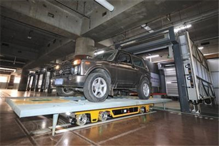 ●停车机器人载着托盘和上面的汽车自动驶入车库停车位。
