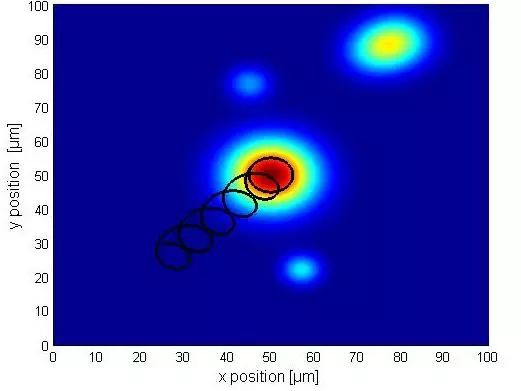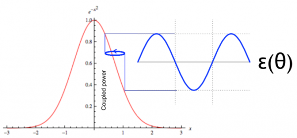 通过圆形抖动确定梯度的图形描述,即调制观察到的耦合功率(或其他量)。相对于抖动的调制相位表示朝向最大值的方向,而其幅度在适当情况下降至0