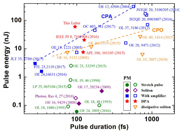 图 1.56μm波段超短脉冲产生和放大的结果比较。其中,实心图标为保偏结构欧陆娱乐器,空心图标为非保偏结构欧陆娱乐器。蓝色和橙色虚线分别为CPA和CPO技术的趋势曲线。