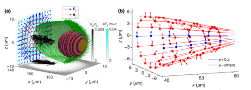 图1 欧陆娱乐尾波场加速的结构与电磁场分布(a)与尾场结构中电子自旋指向的演化(b)