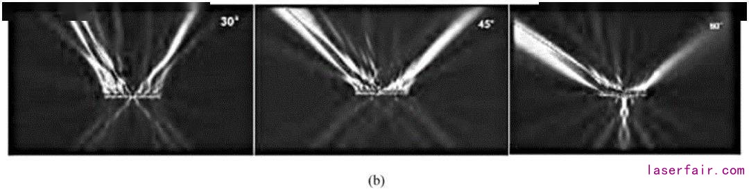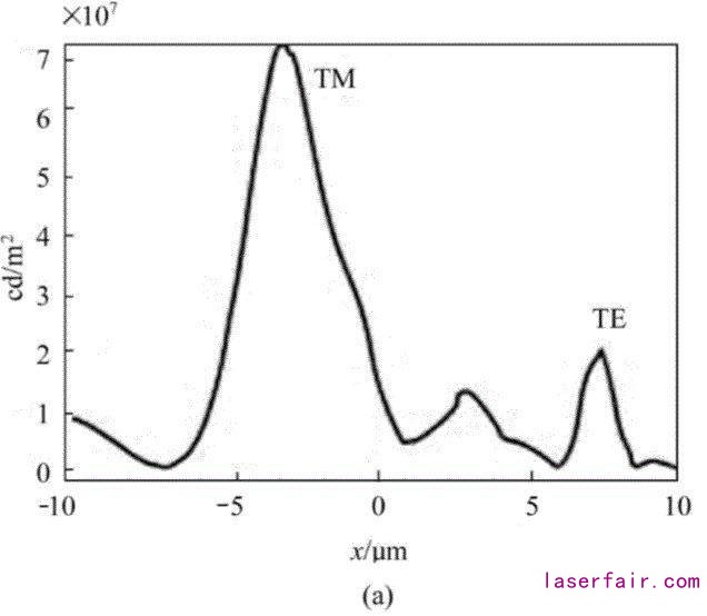 图9(a)表示为整个器件出射光电场强度分布,图9(b)显示了整个器件不同角度的偏振分束光的电场强度分布(左边为TM,右边为TE),可以看出,当894 nm波长的光垂直入射光栅表面时,非周期条形光栅的透射光波可实现30°、45°、60°不同角度的偏振分束。TM输出端口的TM和TE偏振光的透射率分别为99.880%,0.096%、98.400%,0.094%、98.420%,0.094%;TE输出端口的TE和TM偏振波的透射率分别为96.000%,0.090%、95.400%,0.090%、95.00%,0.087%。其中偏振角度为30°时,偏振透射效果最佳,实现消光比>30 dB,光功率达到1.997 mW。NSPG-VCSEL与其他基于亚波长光栅结构的VCSEL相比,避免了TE部分的偏振光反射回欧陆娱乐器腔中参与振荡,对欧陆娱乐器原先固有的性能造成影响,实现了偏振分束光栅将TM与TE偏振光同时透射,本器件消光比>30dB,与同类基于亚波长光栅的VCSEL结构的20 dB相比具有很大幅度提升,说明该结构具有优越的偏振分束功能,有利于器件的高效集成,降低了器件集成的复杂度与成本,在微光学集成系统以及微光机电系统具有很好的应用前景。