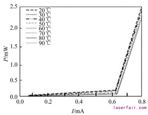 图5表示在20 ℃到90 ℃范围内NSPG-VCSEL的电流—功率曲线。我们通过引入增益腔模失配技术,使得器件的阈值电流在温度上升过程中维持在0.6 mA左右,远远低于一般结构的1.2 mA。在20 ℃到90 ℃范围内,0.8 mA的工作电流下,输出功率稳定在2 mW(数据通信系统要求功率)左右。在26 ℃下器件的输出功率是2.4 mW,当温度上升到90 ℃时,器件输出功率仍能达到2 mW,功率随温度的平均变化系数为0.005 mW/℃。结果表明,NSPG-VCSEL的I - P特性与在室温相比未发生明显衰退,在高温90 ℃的情况下,仍可满足数据通信系统对器件输出功率的要求。